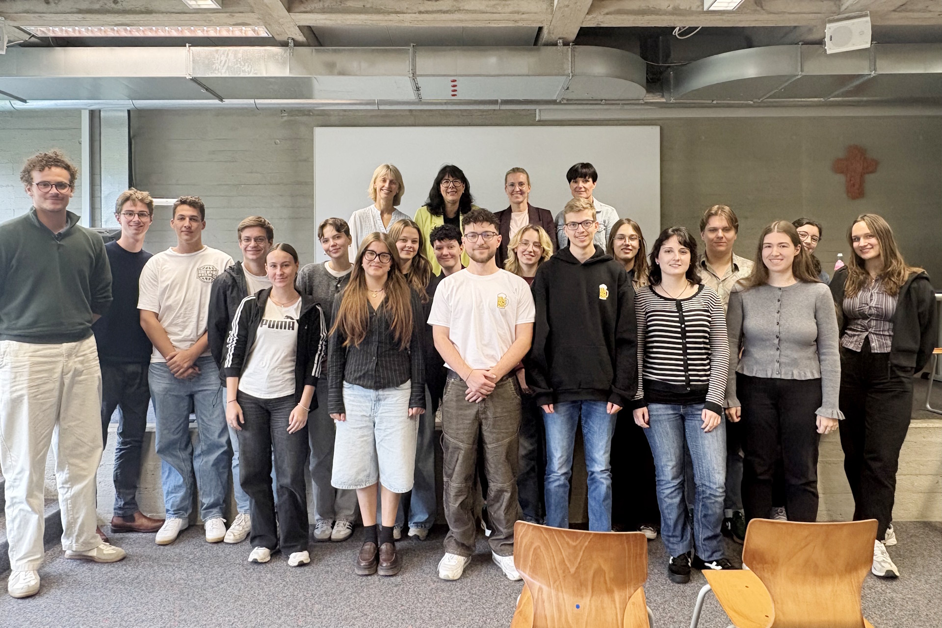 Hintere Reihe, von links: Stefanie Hammerl (Lehrerin und Teil der Schulleitung), Daniela Krauss (Ausbildungsleitung und Personalleitung FVHG), Nadine Sprotte (Personalreferentin) und Andrea Schwarz (Lehrerin) // Vordere Reihen: Schüler des Gymnasiums Friedberg